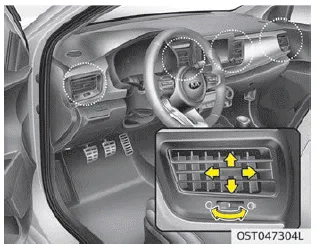 Der größte Teil des Luftstroms wird in den Fußraum geleitet und ein kleiner Teil wird zur Windschutzscheibe und zu den Lüftungsdüsen für die Seitenscheiben geleitet.